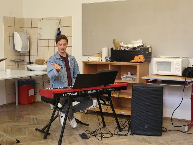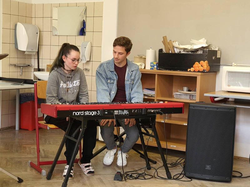 Neben vielen Jazz-Stücken, die Jonas und Johannes zum Besten gaben, vermittelten sie den Jugendlichen auch Einblick in die Funktionen eines E-Pianos. Johannes zeigte ihnen die vielen Möglichkeiten – von der Imitation verschiedenster Blas- und Streichinstrumente bis zur Nachahmung von Chorstimmen. Nur zwei ganz Mutige wollten selbst das E-Piano "ausprobieren": Ein Mädchen und ein Junge intonierten mit wenigen Tönen, unter Begleitung von Johannes und Jonas, kleine Musikstücke.