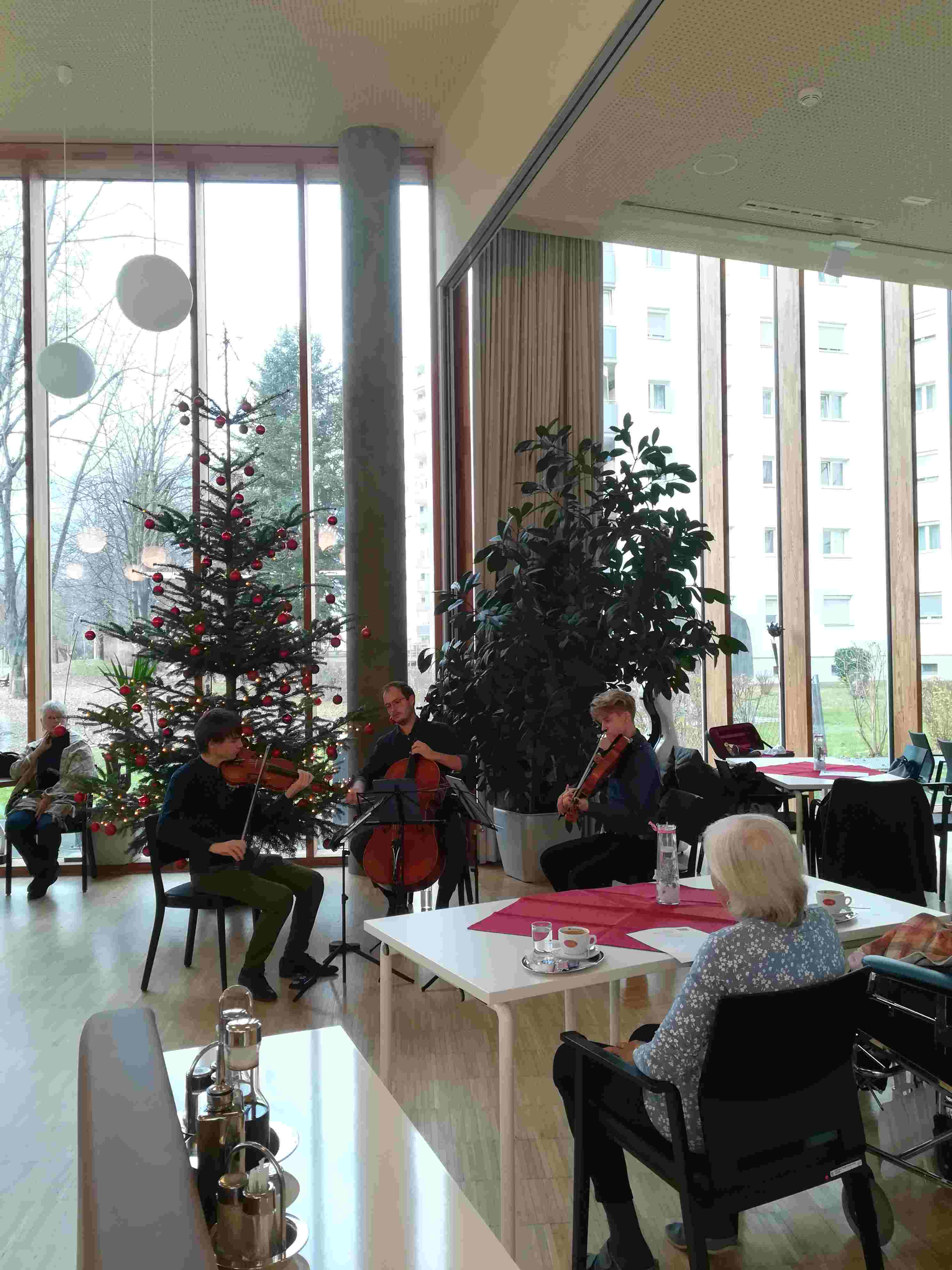 Am Dienstag, den 6. Dezember, spielte das „Goldberg Trio“ im ISD Wohnheim im „Café im Grünen“. An die 35 Bewohner*innen waren mit ihren Angehörigen gekommen und lauschten dem sehr festlichen Konzert. Der Applaus für Denis Vasylynets (Violine), Marinus Kreidt (Viola) und David Unterhofer (Cello) war groß. Sogar der Nikolaus schaute nach seinem Besuch bei den Bewohner*innen vorbei.