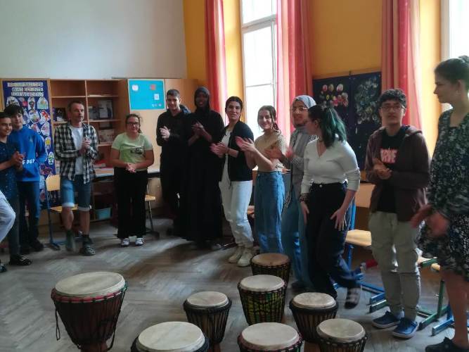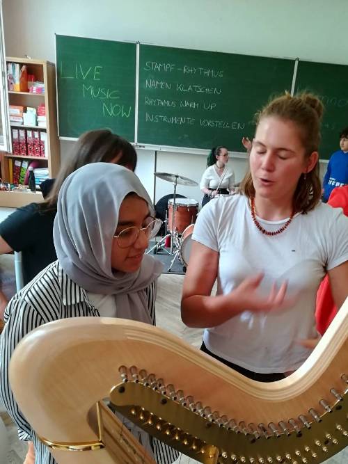 Nach der eingehenden Vorstellung der Instrumente mit kurzen musikalischen Kostproben haben Hannah und Jonas die Jugendlichen zum Mitmachen animiert. Sie haben ihnen gezeigt, wie auch ganz ohne Instrumente Musik und Rhythmus gelingen können. Die Jugendlichen waren mit Begeisterung dabei. Einige probierten sich an der Harfe und am Schlagwerk.