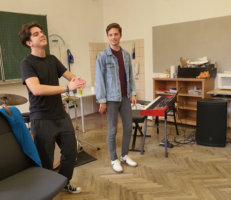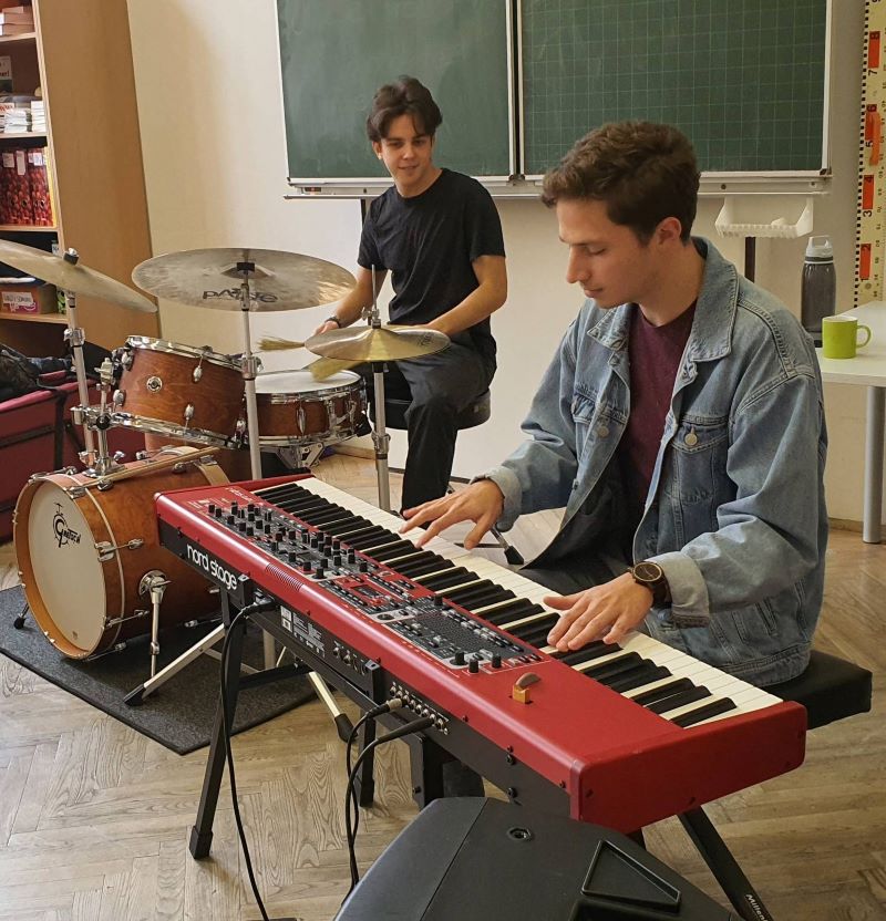 Die beiden Musiker brachten zum Workshop ihre eigenen Instrumente mit: Johannes Trieb sein E-Piano und Jonas Zink sein Schlagzeug.