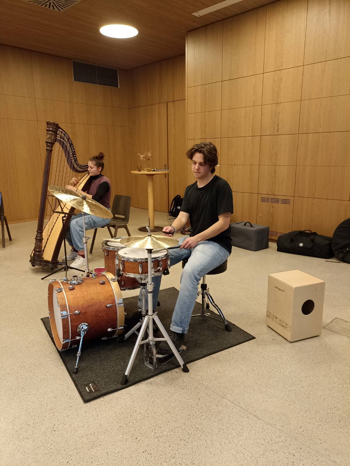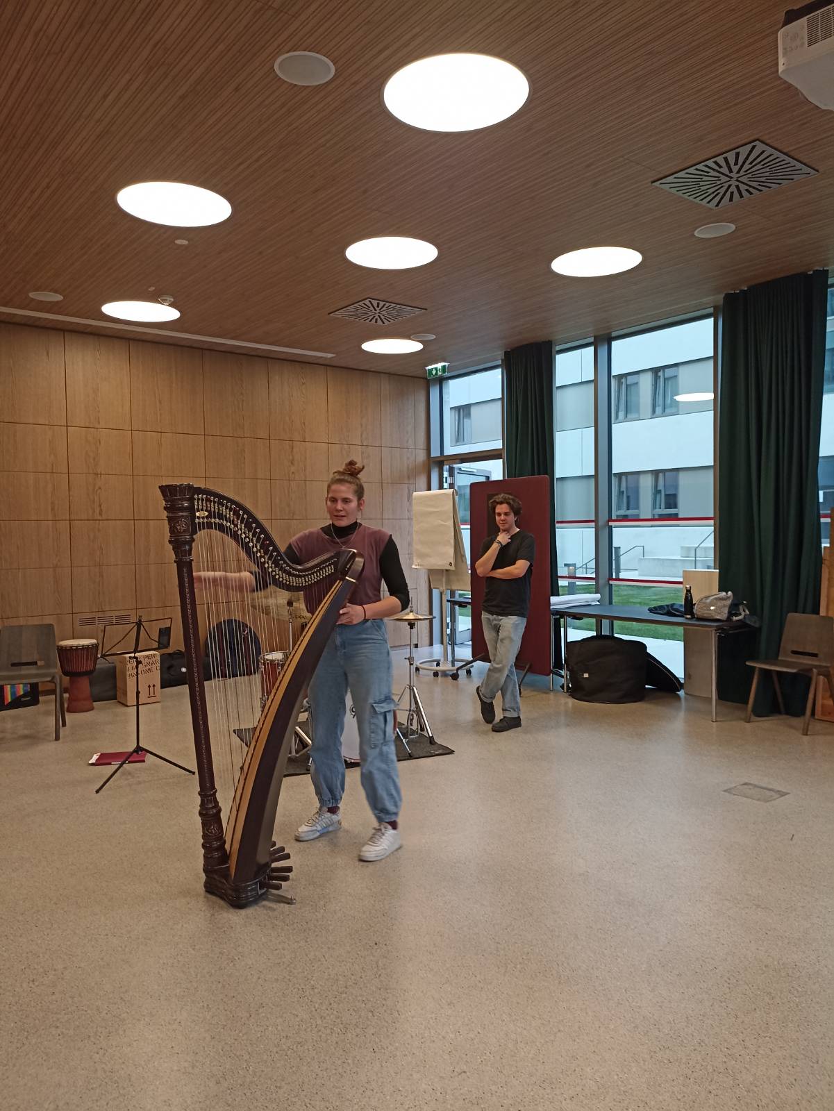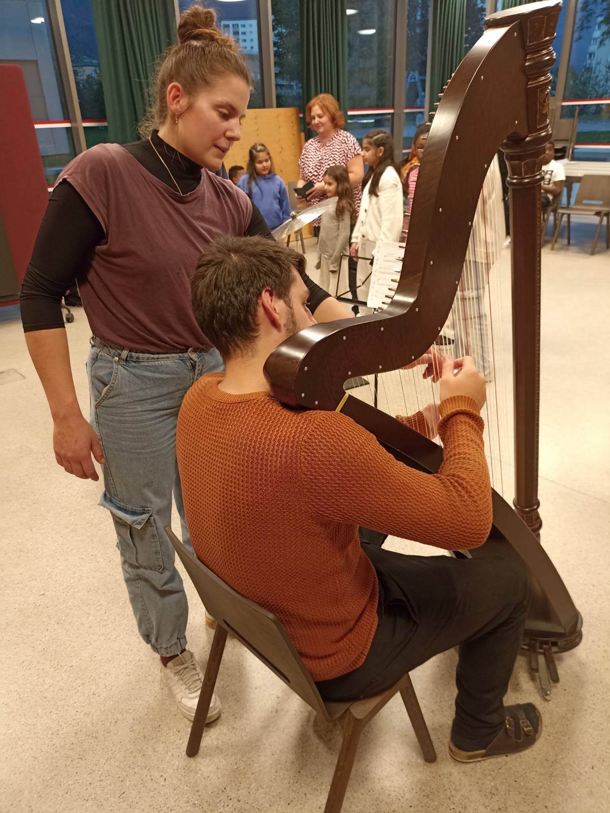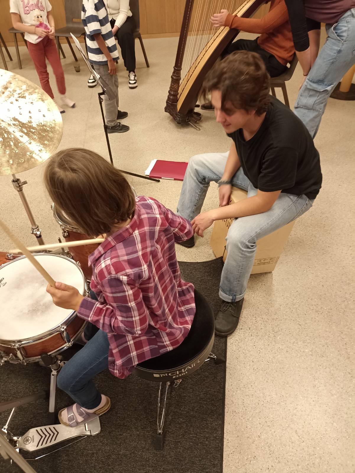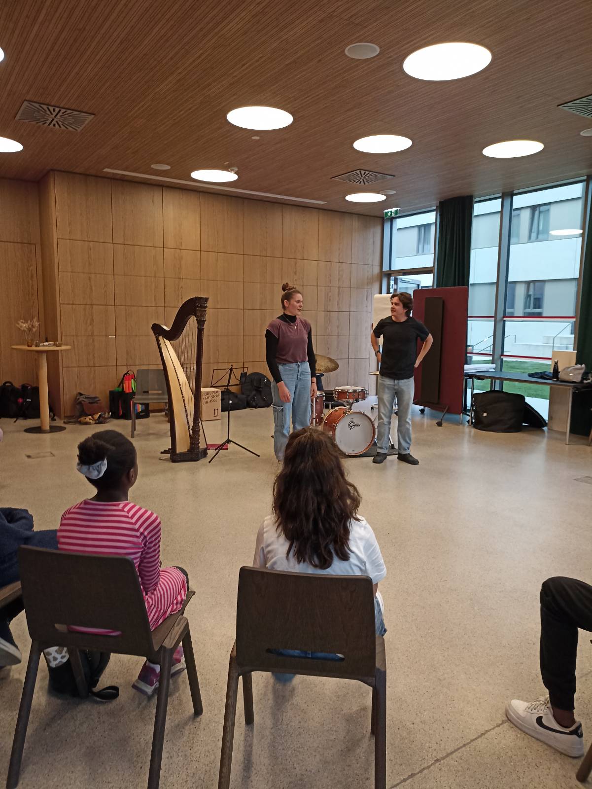 Die zu Beginn scheuen Kinder tauten schnell auf. Die Chance, echte Musiker*innen und ihre Instrumente unter die Lupe zu nehmen, hat sie ihre Hemmungen schnell überwinden lassen. Das gute Dutzend Kinder, begleitet von fünf Erwachsenen, hat mit Freude beim Workshop mitgemacht. Die Kleinsten waren zwar anfangs ein wenig schüchtern, waren dann aber trotzdem mit Freude dabei.