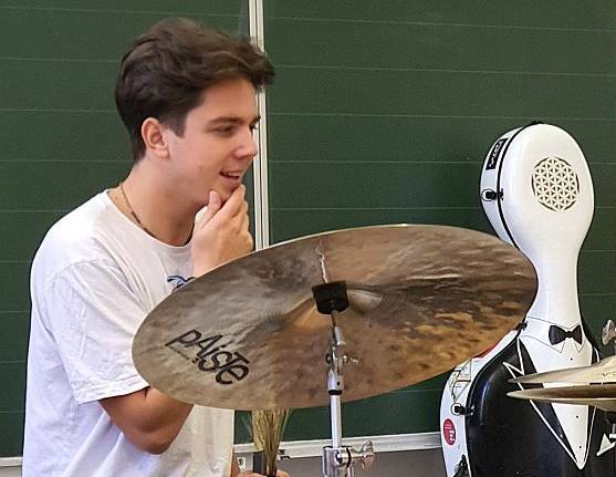 Der Schlagzeuger Jonas Zink und sein Kollege Johannes Trieb am Klavier führen gemeinsam mit den Schülerinnen und Schülern der Daniel-Sailer-Schule (Innsbruck) einen Workshop durch. Es ist der dritte im Rahmen eines auf ein Jahr angelegten Projekts.